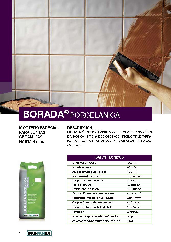 BORADA PORCELÁNICA est un mortier spécial à base de ciment, granulats à granulométrie sélectionnée, résines, additifs organiques et pigments minéraux stables