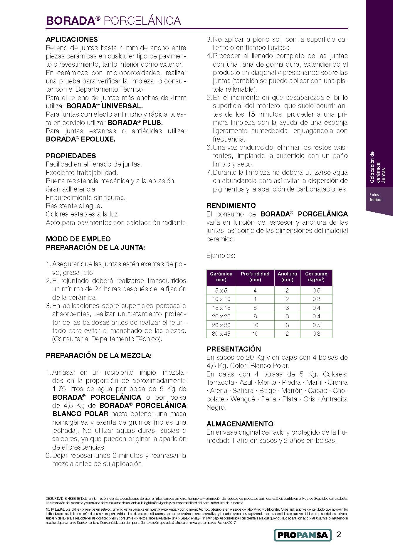 La consommation de BORADA PORCELÁNICA varie en fonction de l’épaisseur et de la largeur des joints, ainsi que des dimensions du carreau céramique.