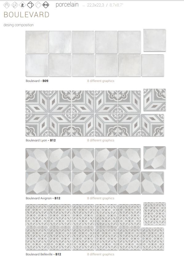 Série BOULEVARD. Carrelage Grès Cérame imitation Carreaux de Ciment avec finition mate disponible au format 22,3×22,3