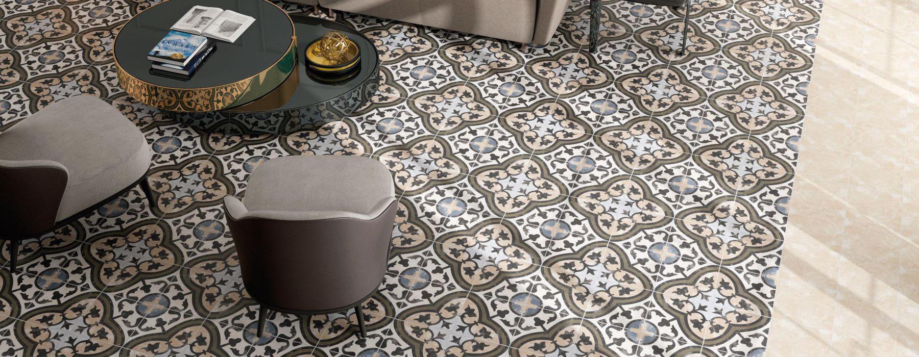 Série EVOQUE. grès cérame imitation crreau de ciment au format 25×25, présente une finition mate.