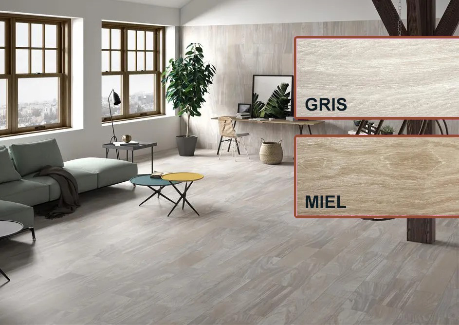 Série MADDEN est un carrelage en pâte rouge imitation bois en format 20,5×61,5 et finition Mate parfait pour les sols. Disponible dans les couleurs Miel et Gris.