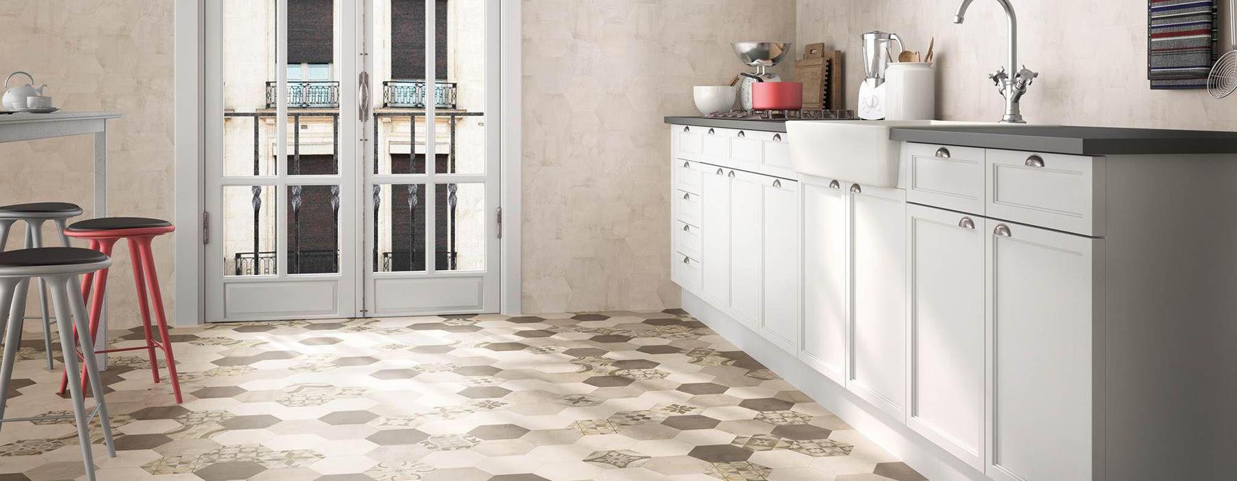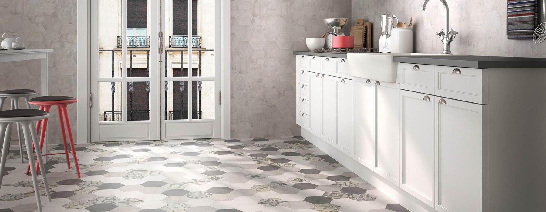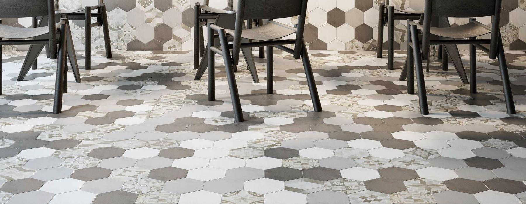 Série MADELAINE. carrelage effet carreau de ciment en format 17.5×17.5 hexagonal, finition mate.