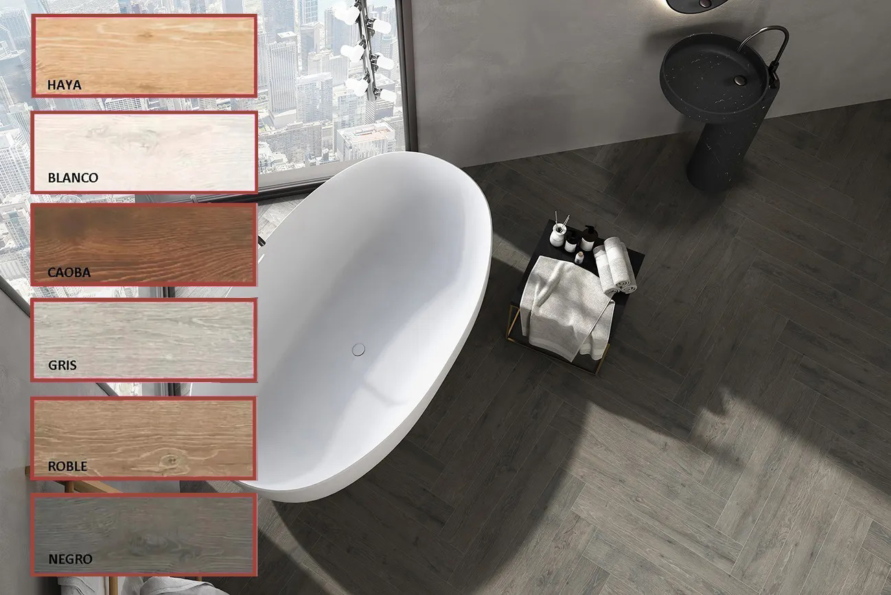 Cette série présente la finition SLIPSTOP, qui convient à la fois aux intérieurs et aux extérieurs grâce à sa texture lisse mais en même temps antidérapante et facile à nettoyer.